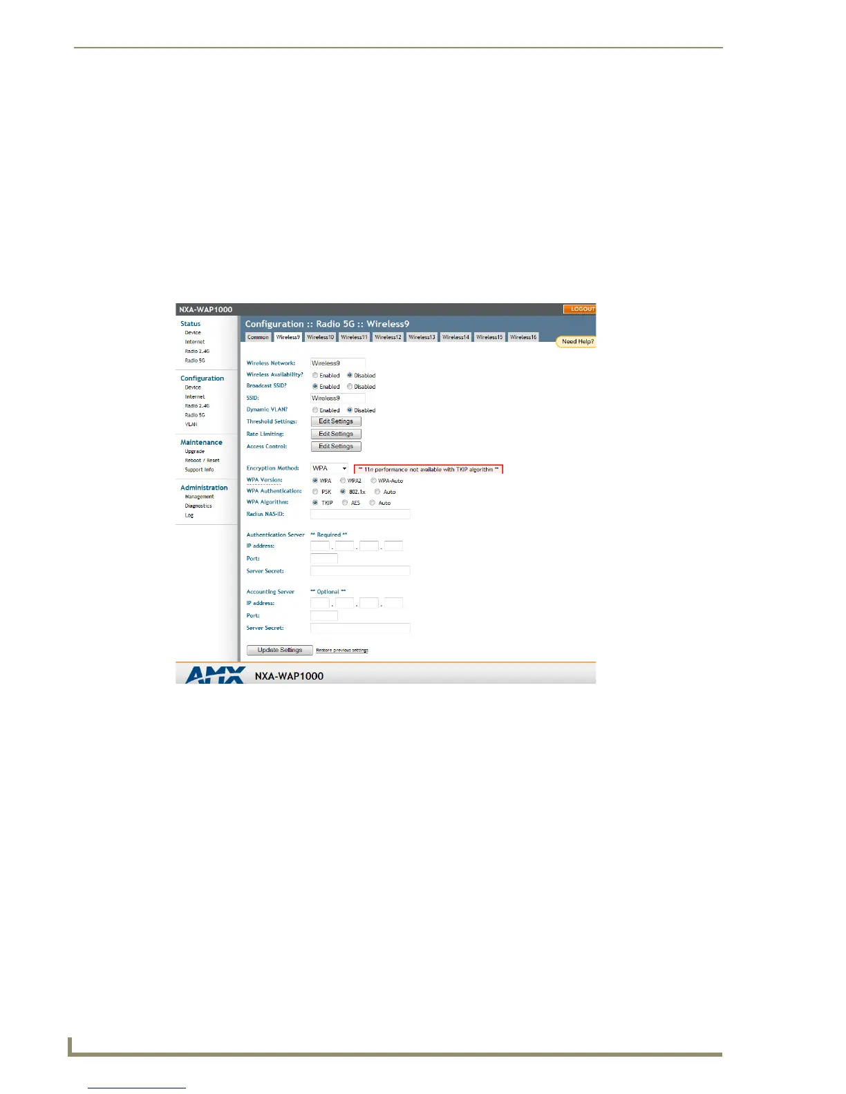 2. Click a Wireless # tab to configure. The Configuration :: xx :: Wireless[#] page appears (FIG. 17).