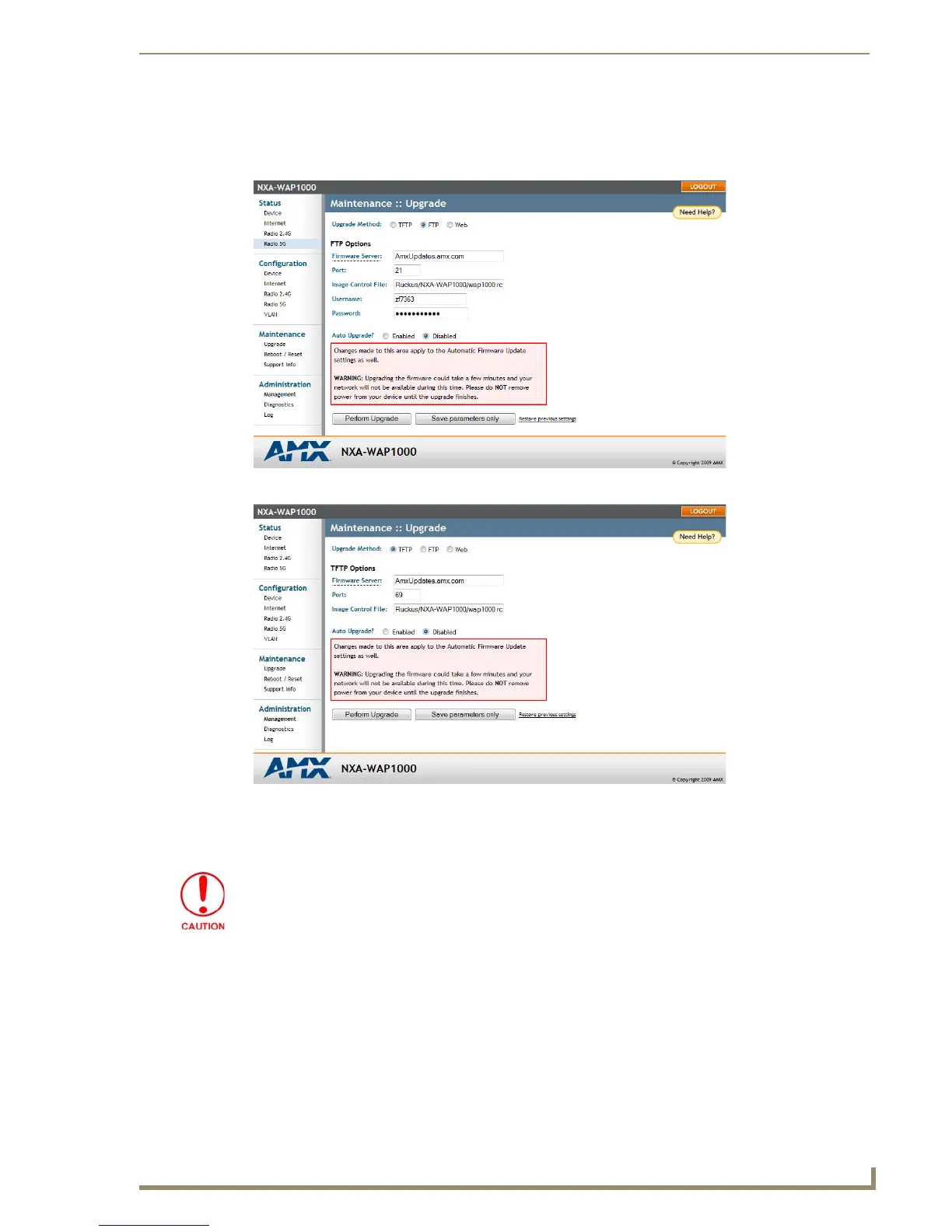 In the Upgrade Method options, click FTP or TFTP. This opens either the FTP (FIG. 30) or TFTP