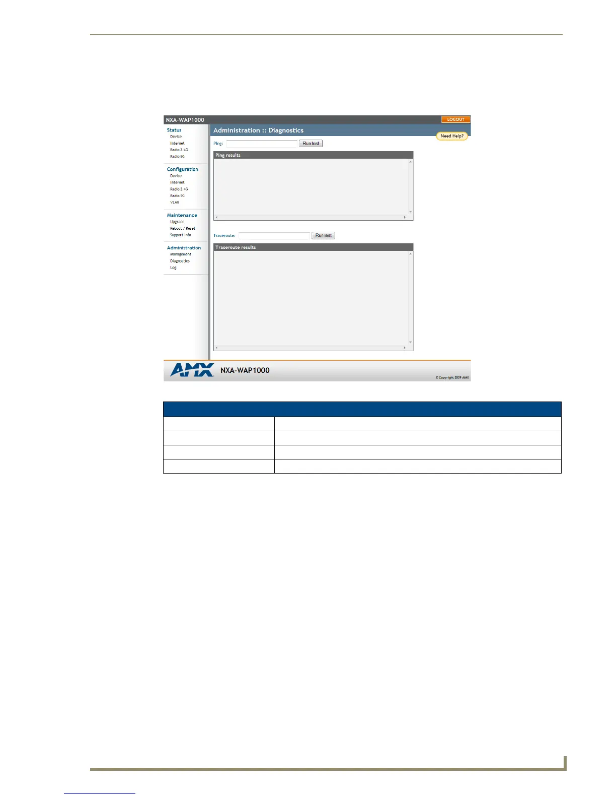 Two network connection diagnostic tools – PING and traceroute – have been built into the NXA-WAP1000 to
