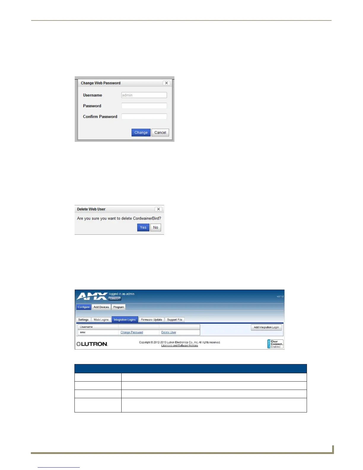 1. In the Web Logins tab, click the Delete User link on the appropriate web login to open the Delete User window