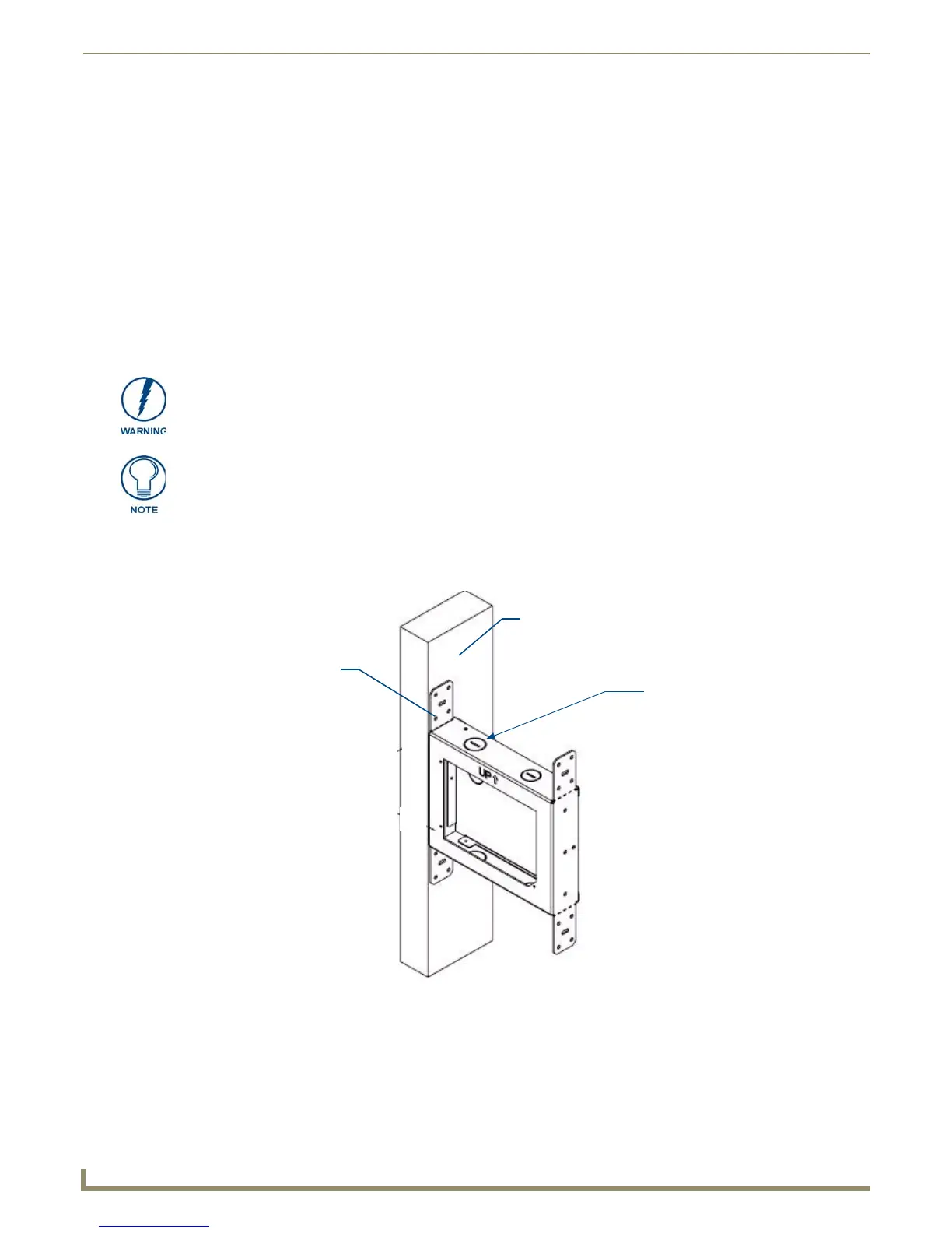The following sections describe mounting the touch panel directly into a pre-wall rough-in box, a solid surface, drywall,