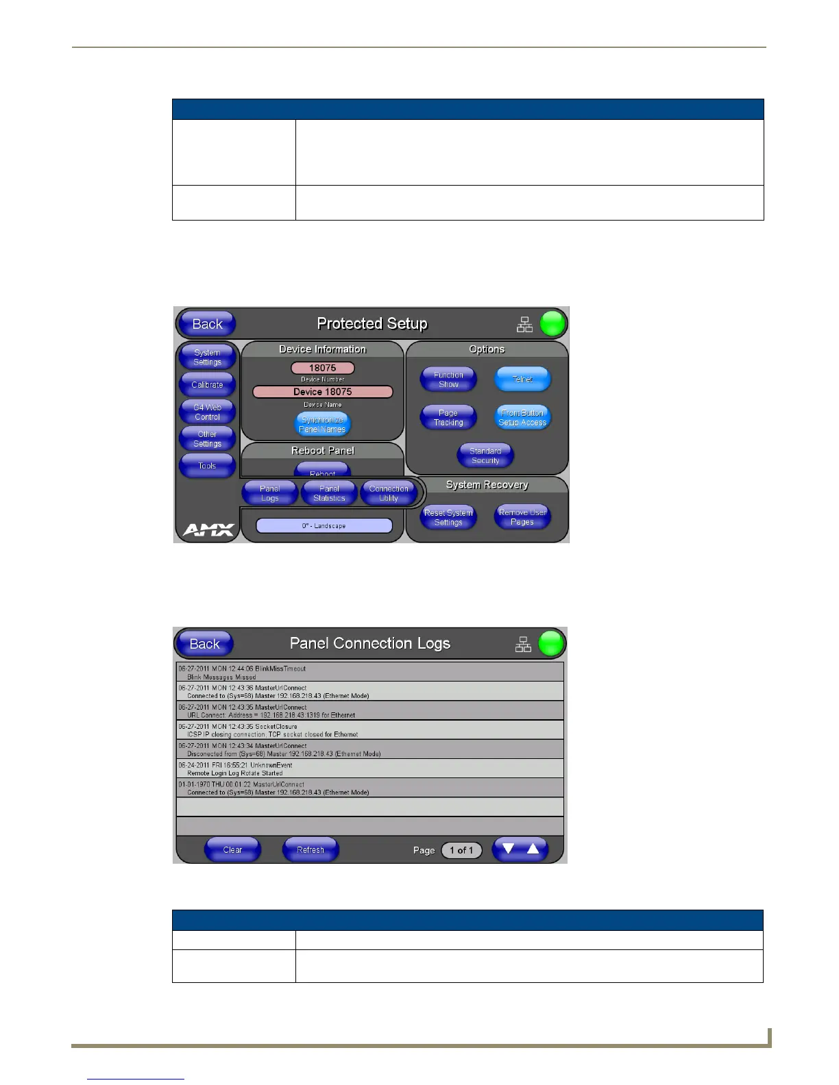 The Tools button provides a menu to select either the Panel Connection Logs Page section on page 61, the Panel