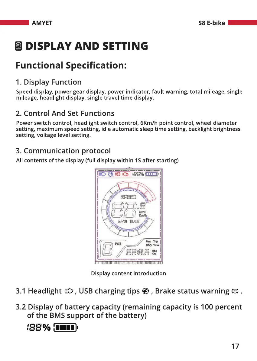 Power switch control, headlight switch control, 6Km/h point control, wheel diameter