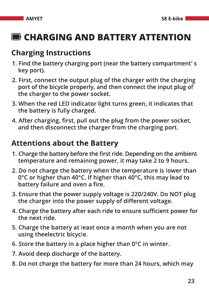 1. Charge the battery before the first ride. Depending on the ambient