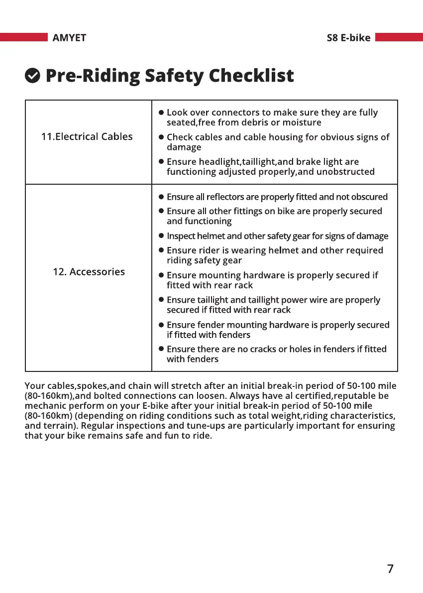 Your cables,spokes,and chain will stretch after an initial break-in period of 50-100 mile