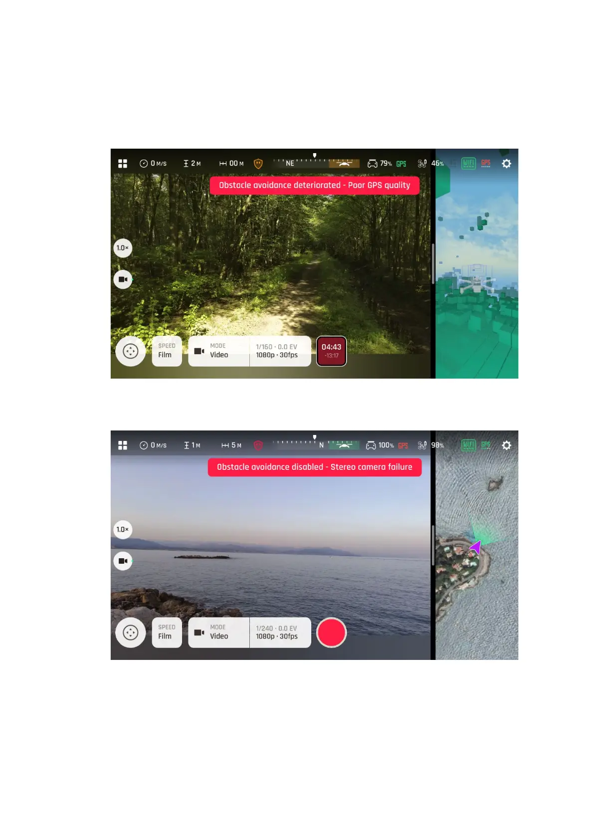 If you see the “stereo camera failure” as in the latest screenshot, land your drone as