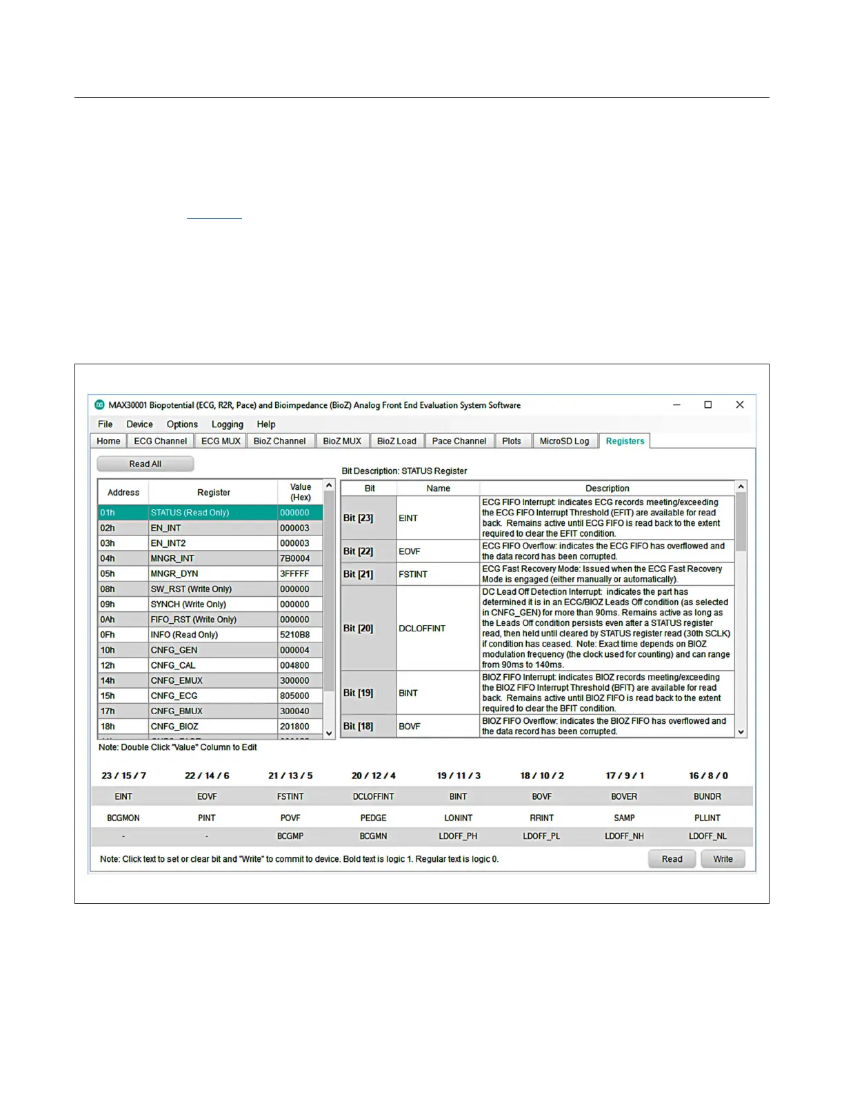 The Registers tab (Figure 15) provides more direct access to the internal registers of the MAX30001. From this tab, it is