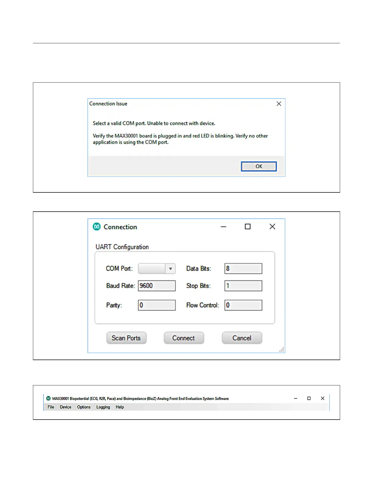 Figure 2. The Connection Screen Allows The User to Select Which COM Port Contains the EV Kit.