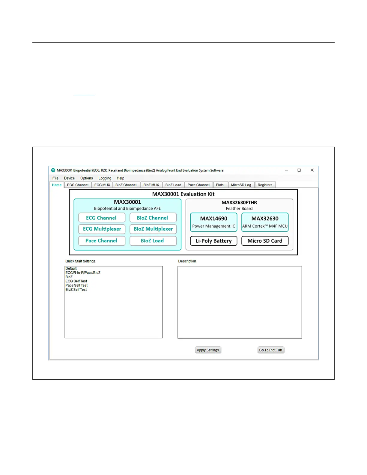 The Home tab (Figure 5) provides an overview of the MAX30001 EV kit’s features and preset register congurations.
