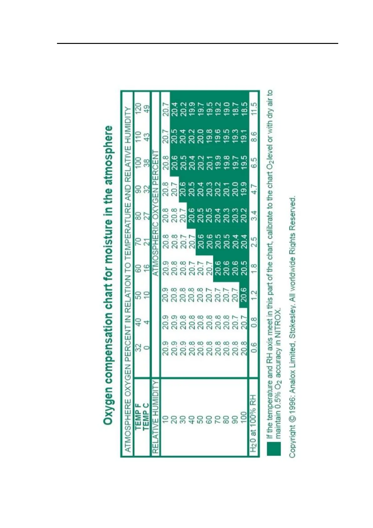 ANALOX 02 EII Pro - Oxygen Compensation Chart for Moisture in the Atmosphere