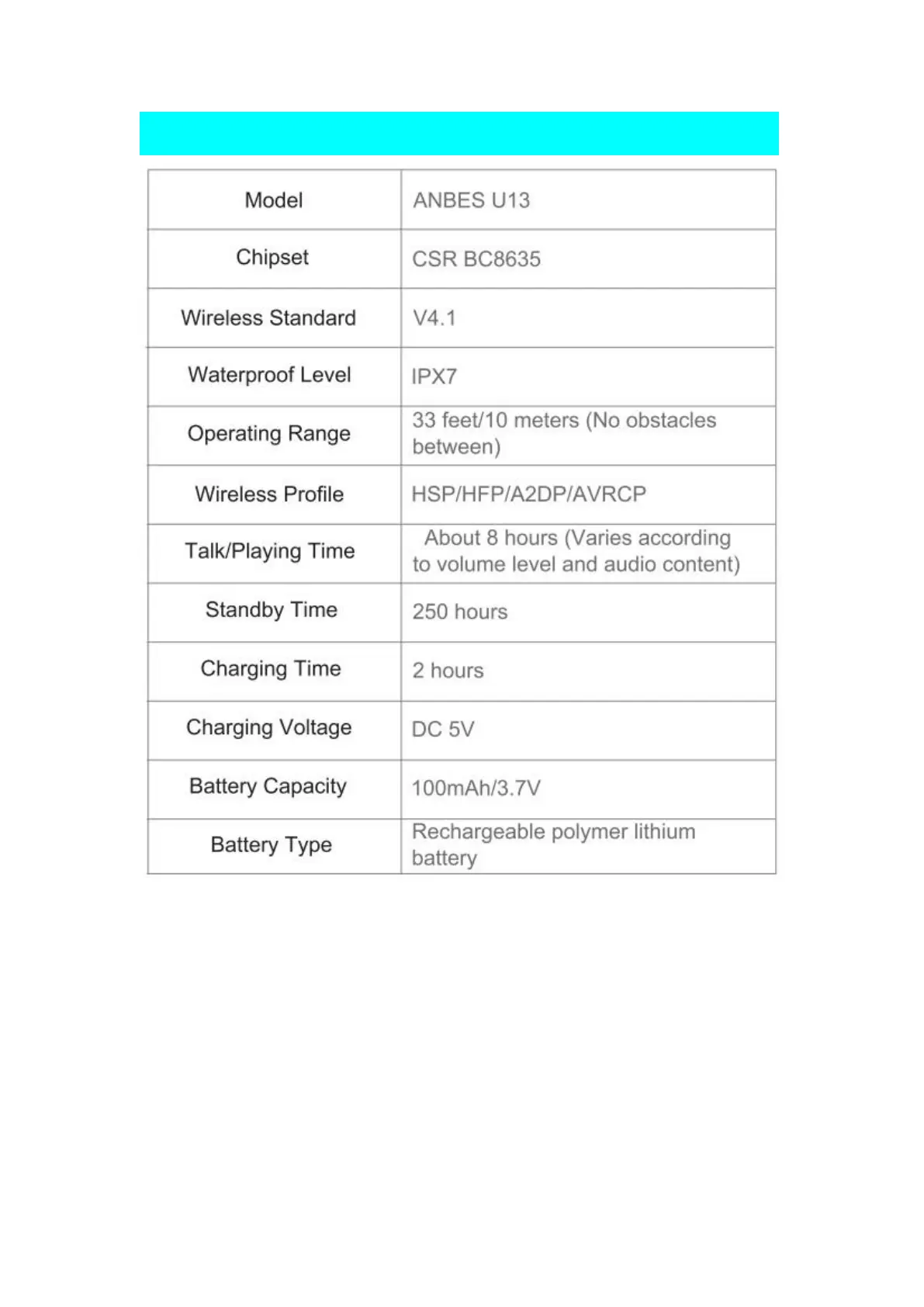 ANBES U13 - Specifications