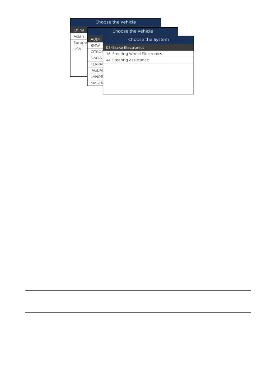 the tests available on the identified vehicle displays. Menu options typically include: