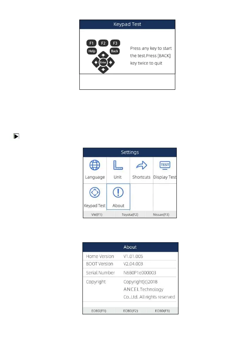 Selecting About option opens a screen that shows information about your scan tool, such as serial