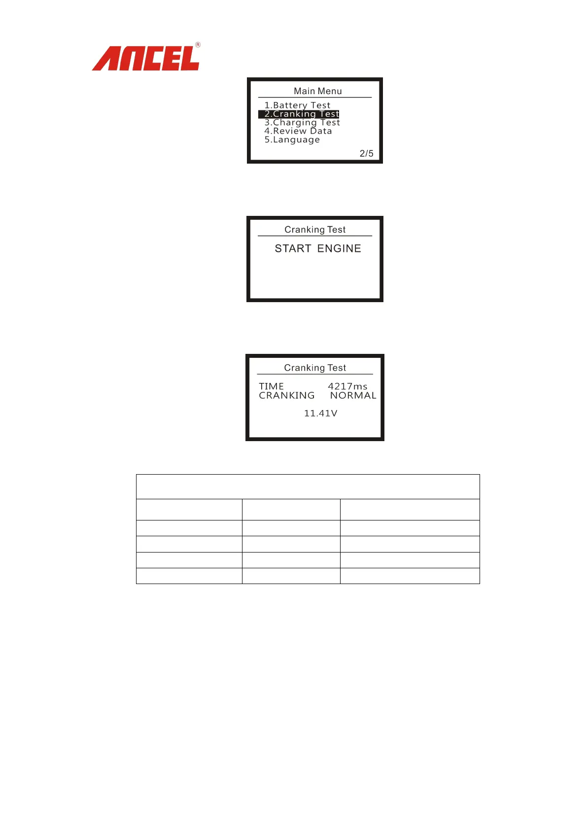 Press <ENTER> to Cranking Test interface. Start the engine as guide displayed in the screen.