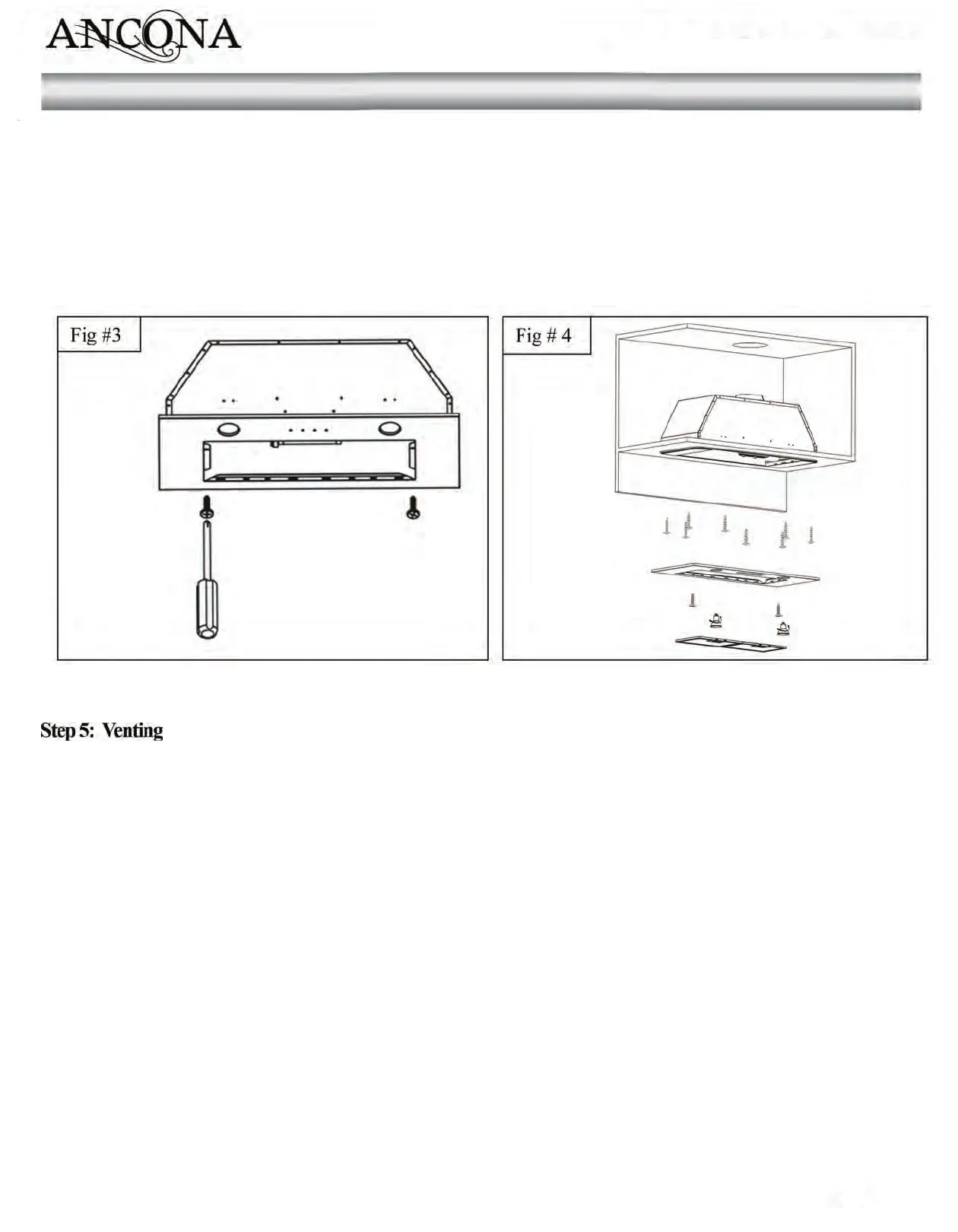 • Align range hood to the opening in the bottom of the cabinet and screw in using the screws provided. (See Fig # 4)