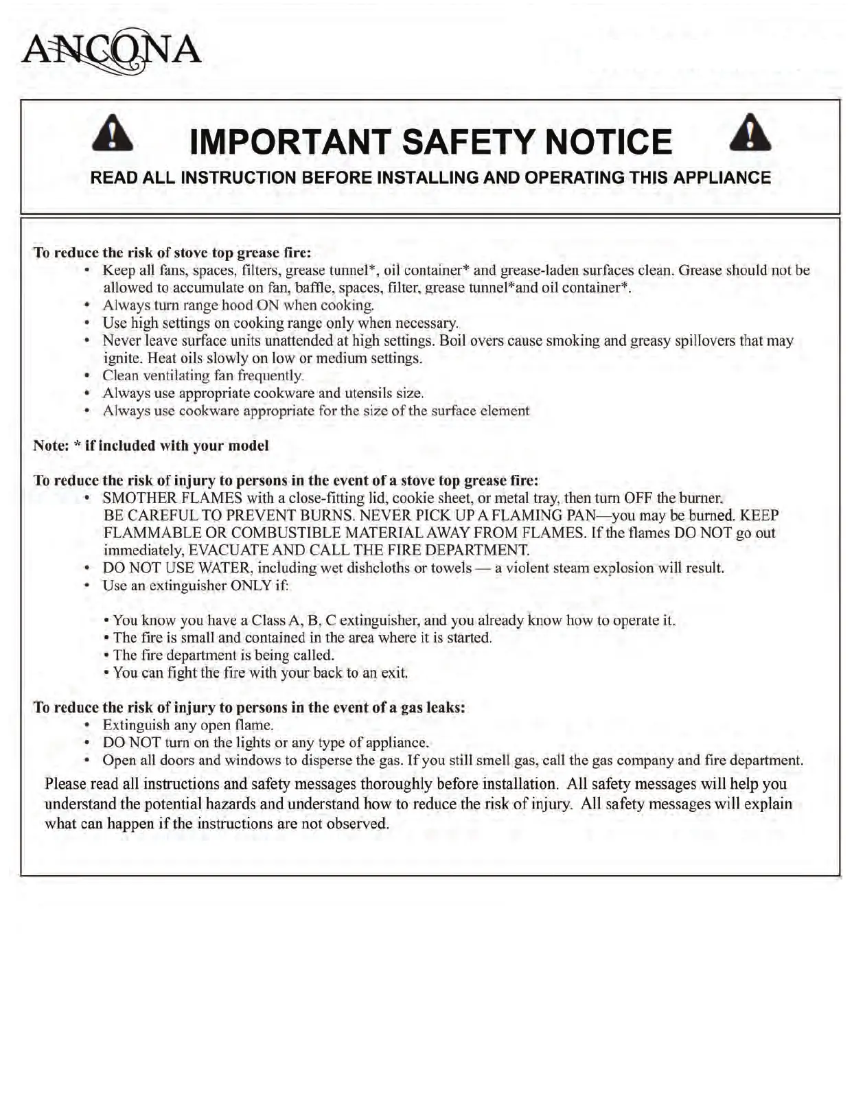 Ancona INSERTA 28 - Stove Top Grease Fire Prevention; Grease Fire Safety Measures; Grease Fire Response; Gas Leak Safety