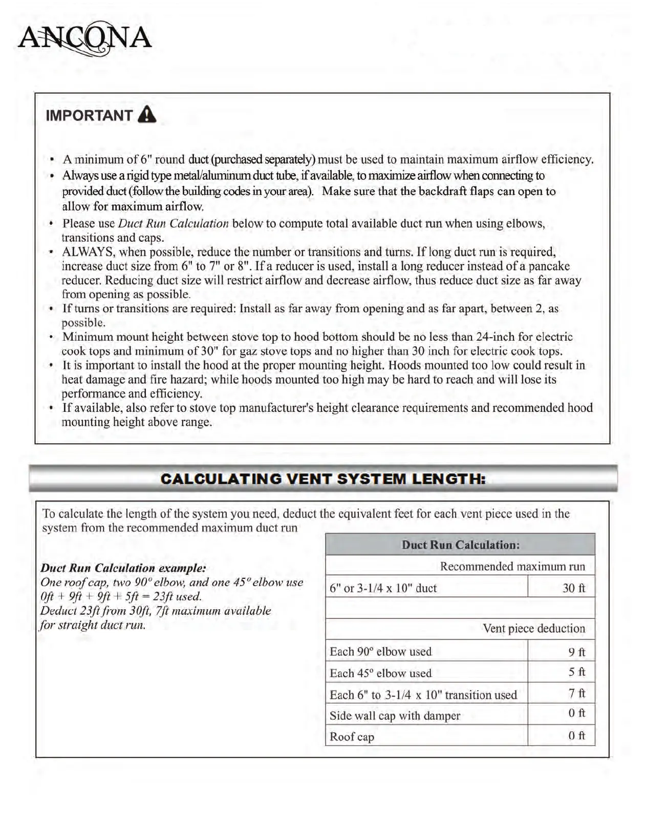 Ancona INSERTA 28 - Ducting and Mounting Height; Duct Size and Airflow; Mounting Height Considerations