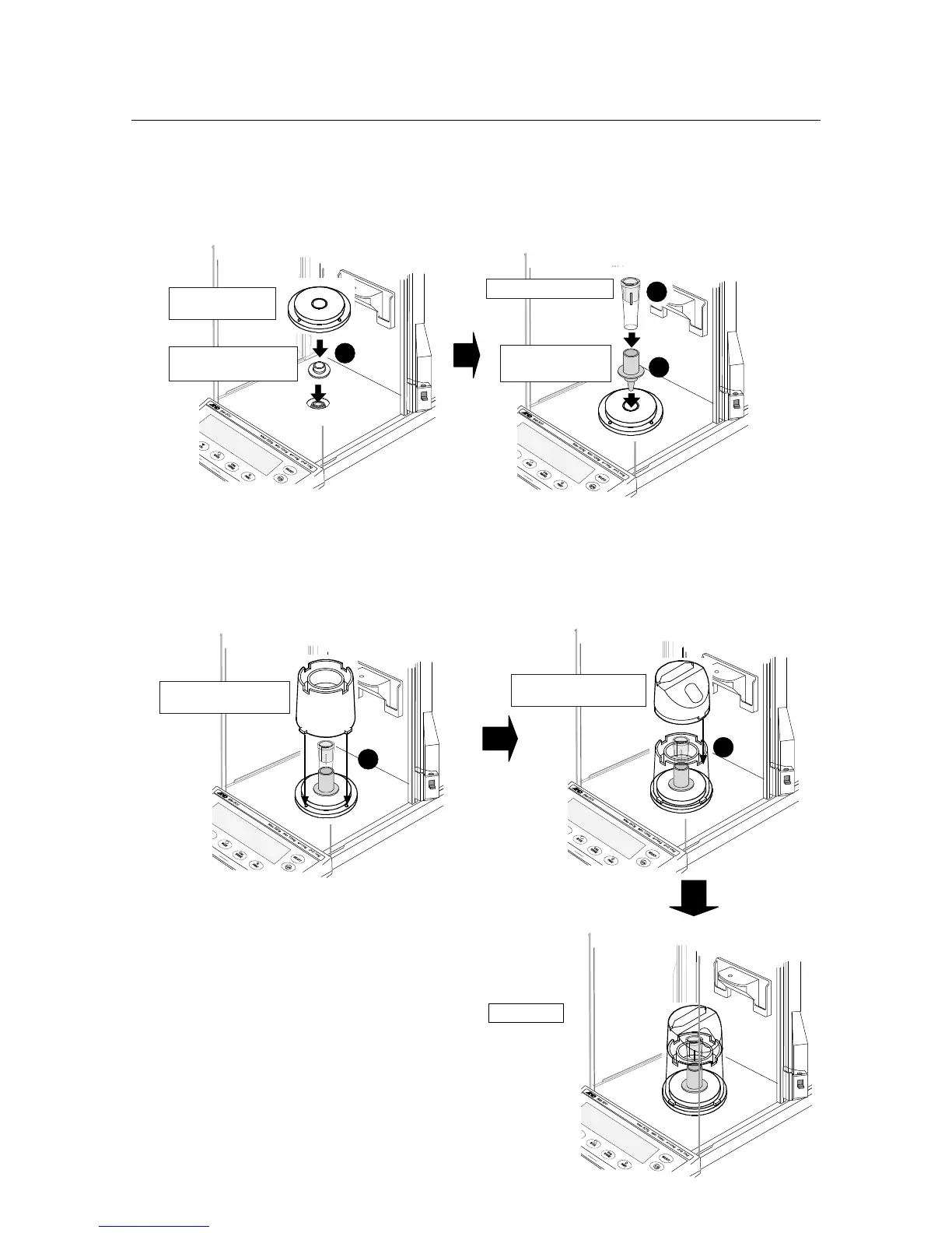 1 Install the center positioning boss and evaporation trap base on the BM balance.