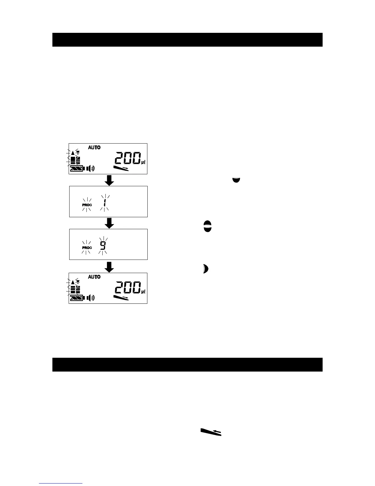 The nine programs can be saved in the program memory built into the pipette (PROG