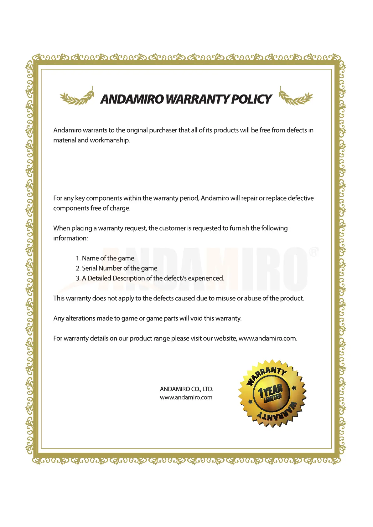 Andamiro AVENGERS - Andamiro Warranty Policy; Warranty Terms and Conditions