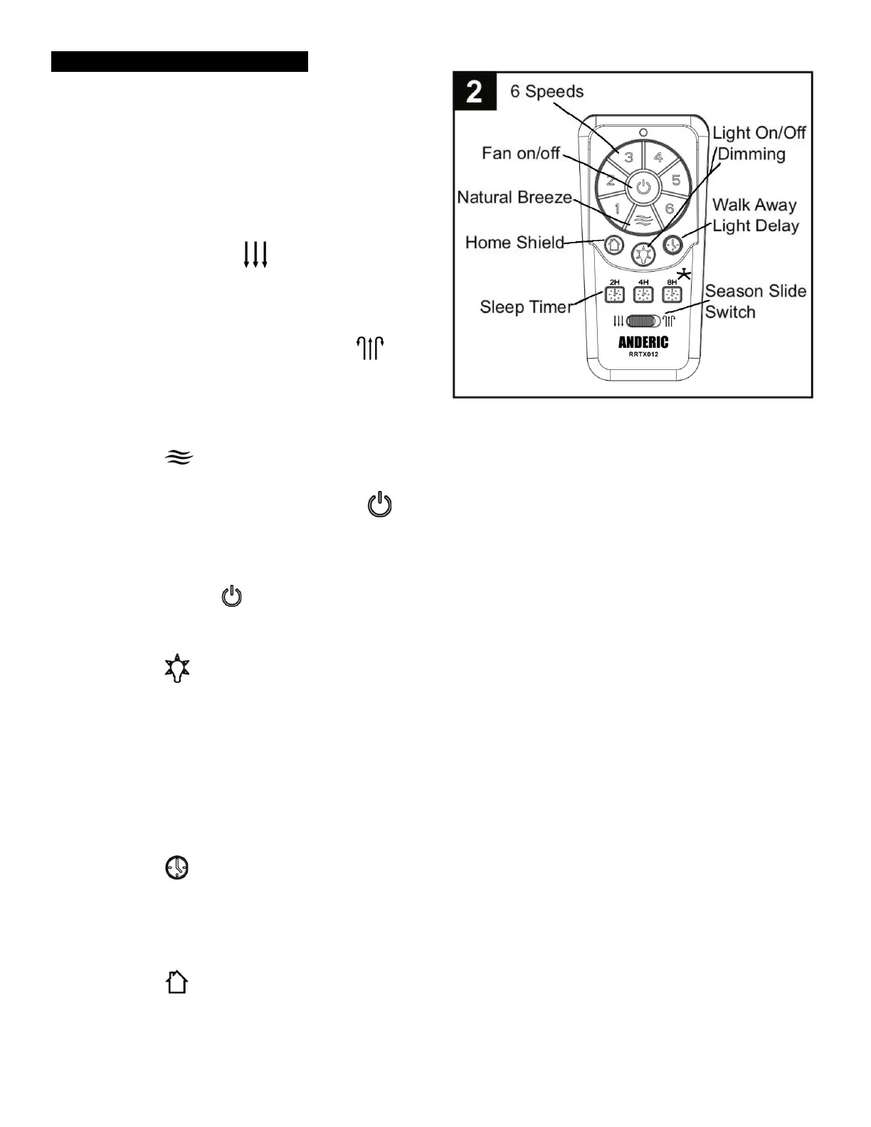 • Tap “ ”, light on ceiling fan blinks two times to confirm home shield is active. Fan is off and will