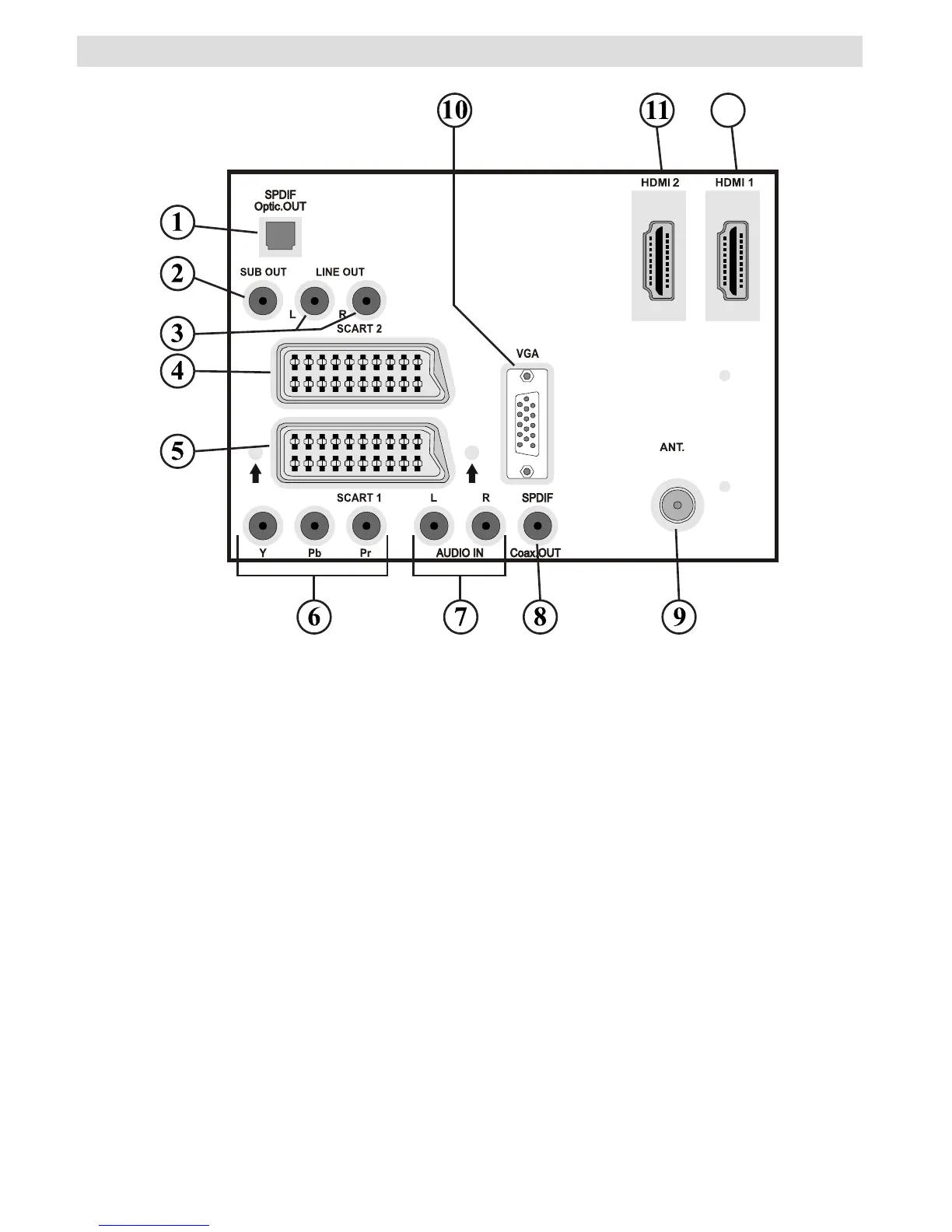 2. Subwoofer Out brukes for å koble til en ekstern, aktiv subwoofer for å gi TV-en en dypere