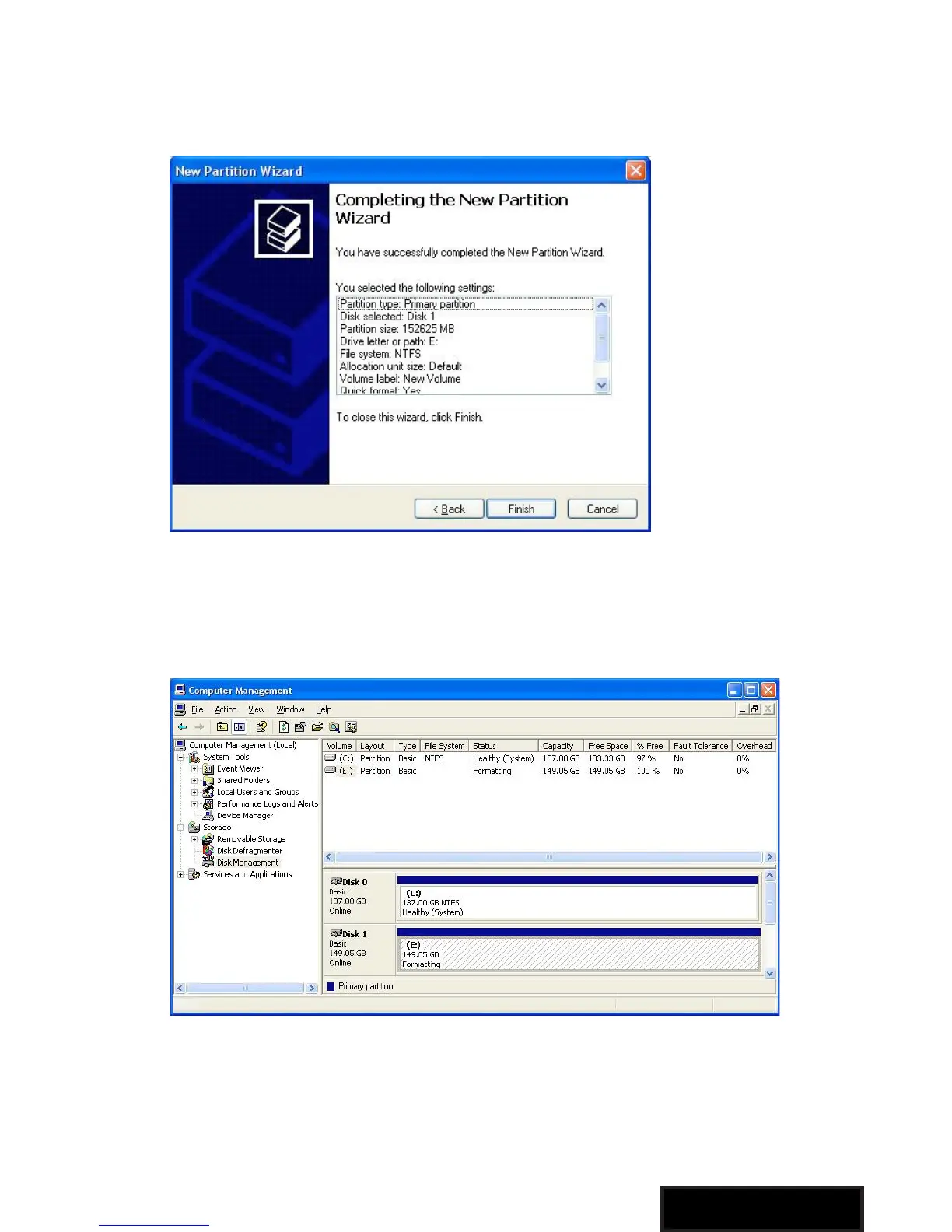 for ny partisjon. Klikk på Fullfør for å utre formateringen av