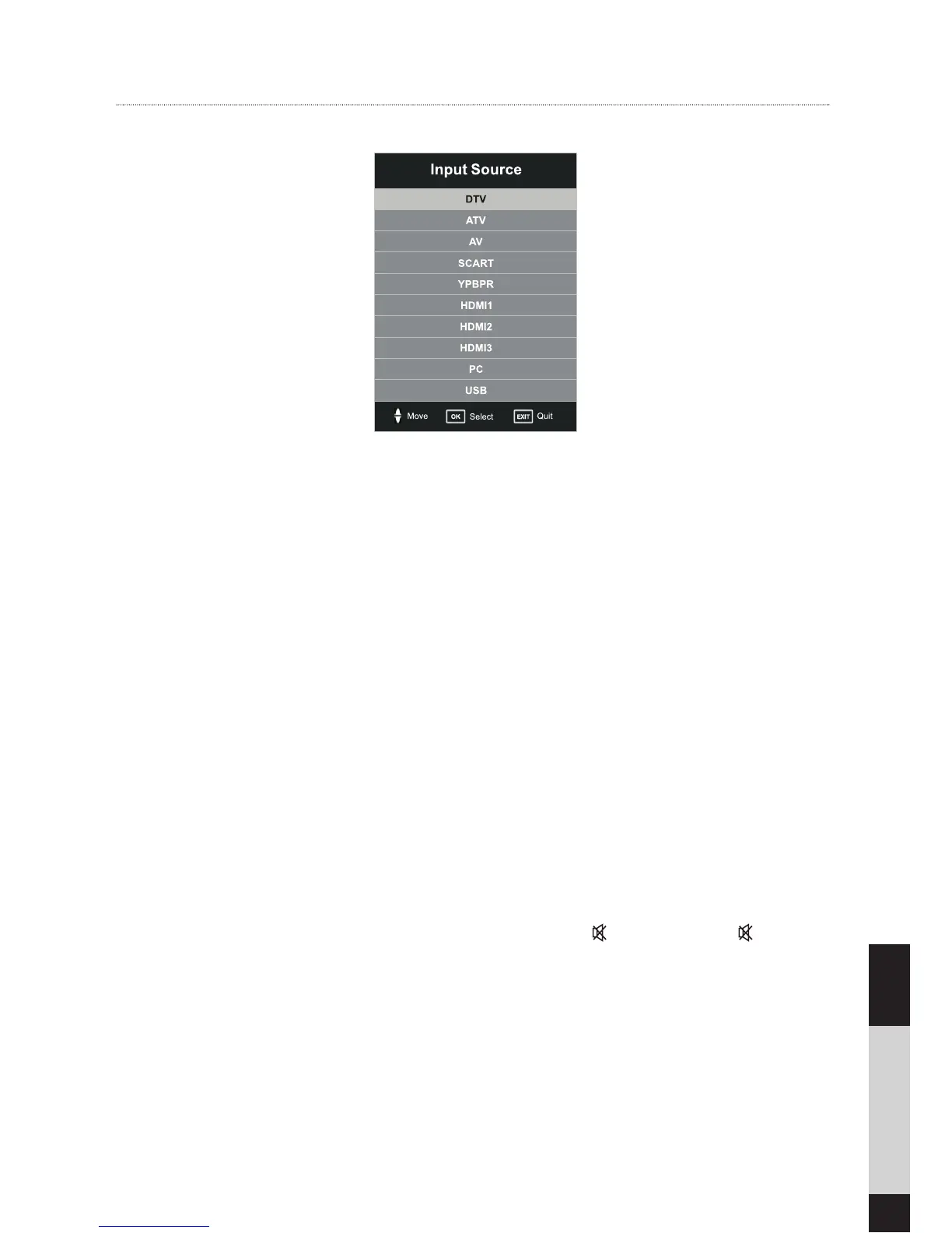 2. Press the / buttons to select the input source that you want: DTV / ATV / AV / SCART / YPBPR /