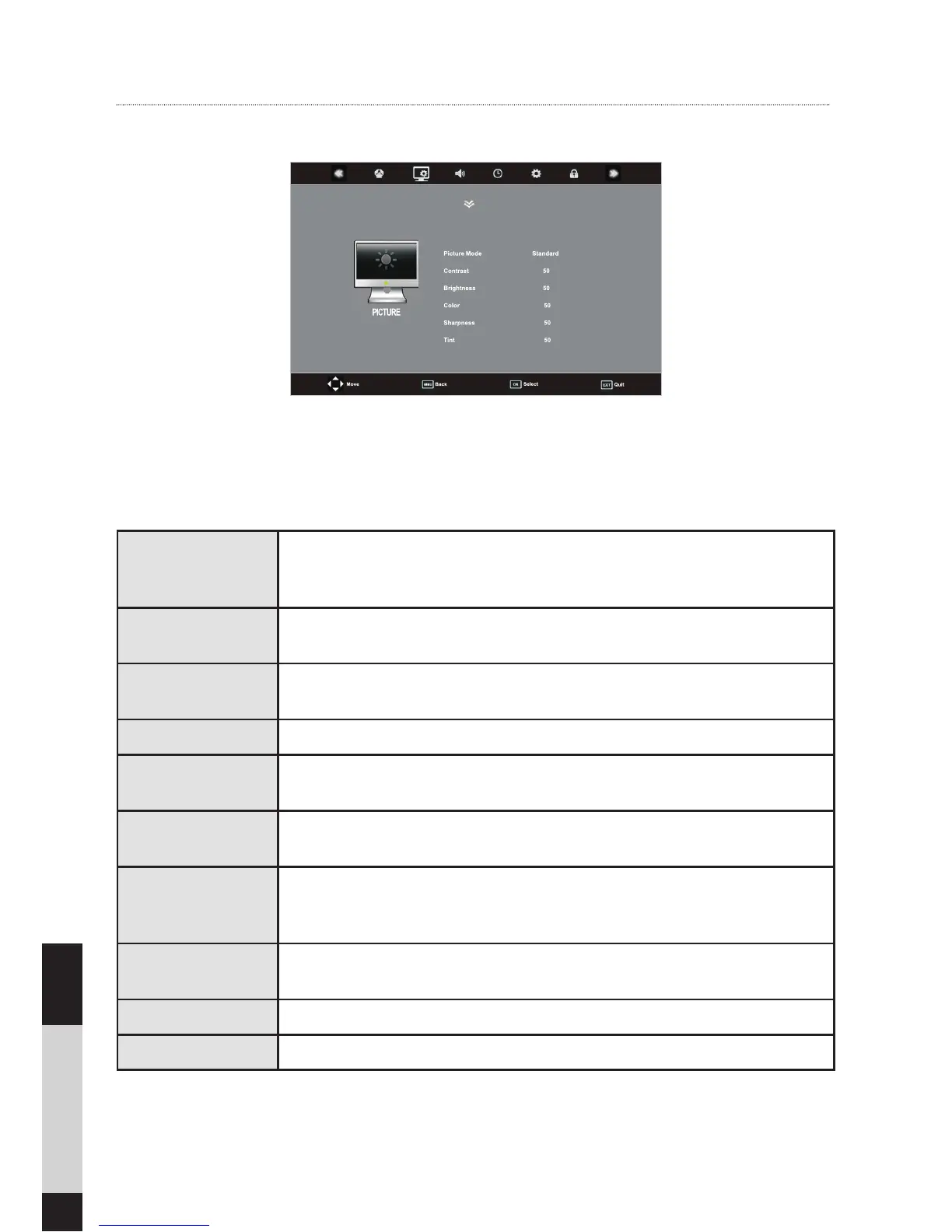 3. Press the buttons to select the option you want to adjust in PICTURE menu.