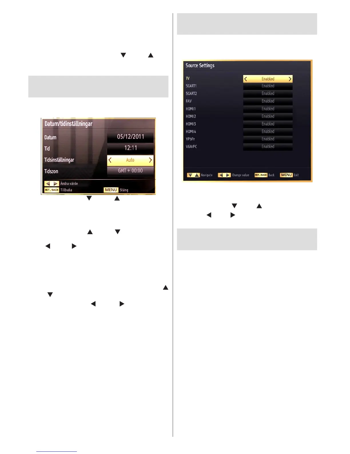 • Välj Källor i inställningsmenyn och tryck på OK-