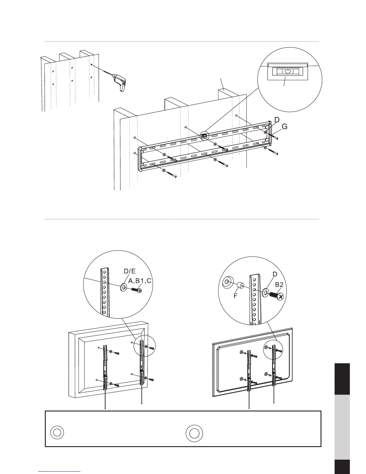 : (D) Small hole for M6 and M8 screws : (E) Medium hole for M10 screws