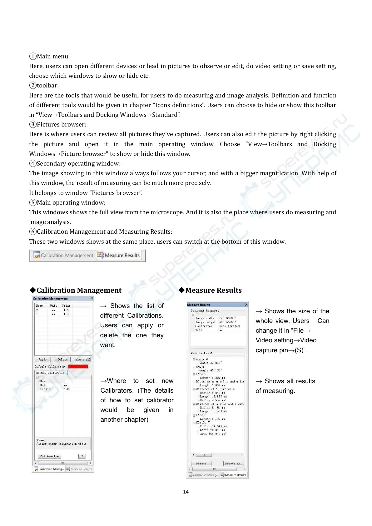 This windows shows the full view from the microscope. And it is also the place where users do measuring and