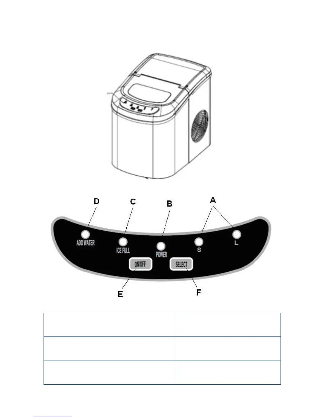 C. Ice-Full indicator F. Buon to select ice cube size.