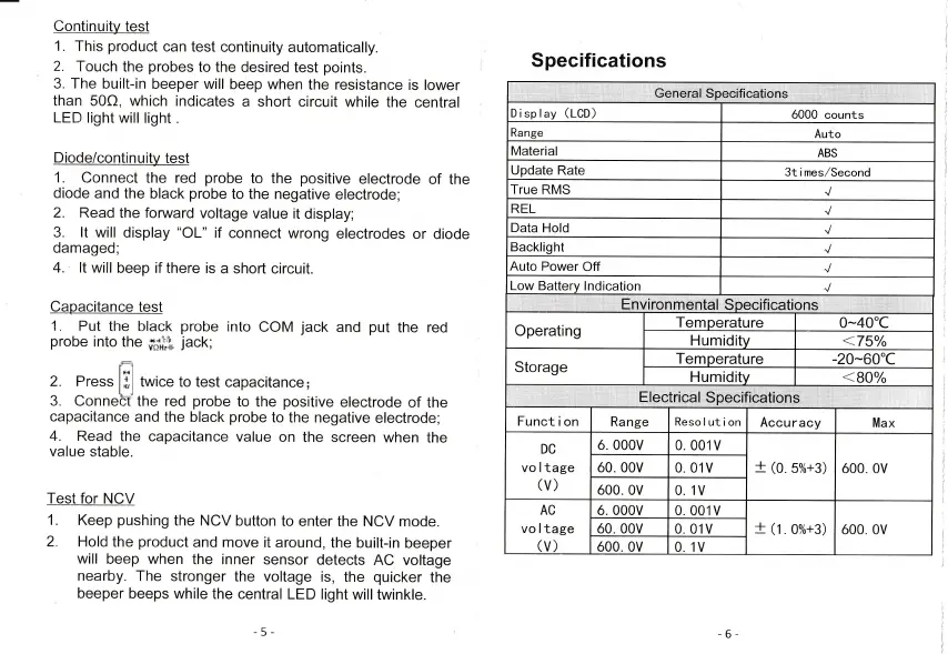 Aneng AN113B - Specific Tests; Continuity Test; Diode;Continuity Test; Capacitance Test
