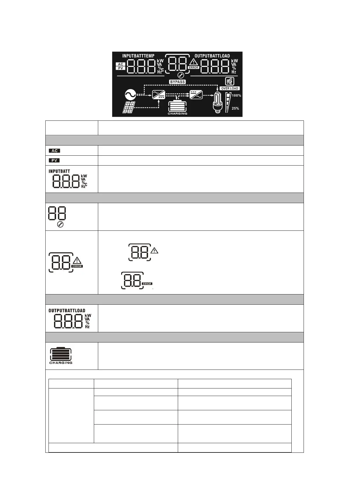 Indicate input voltage, input frequency, PV voltage, charger ,charger power,