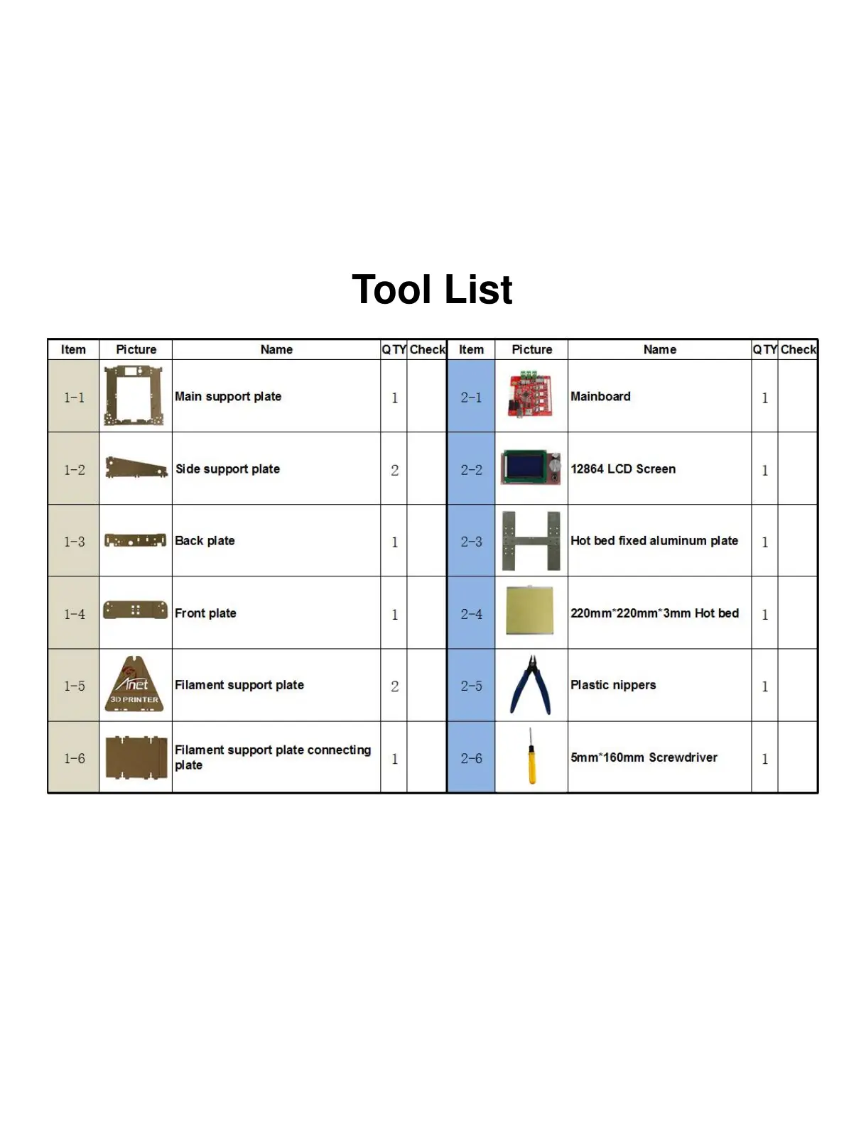 Anet A6 - Tool List