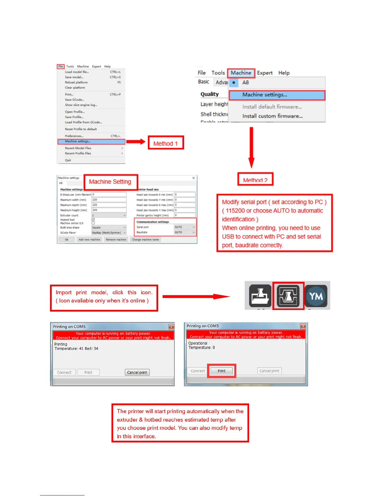 Anets A8 - USB Online Printing for A8 Printer; Configure Machine Settings for USB Printing; Performing Online Printing via USB