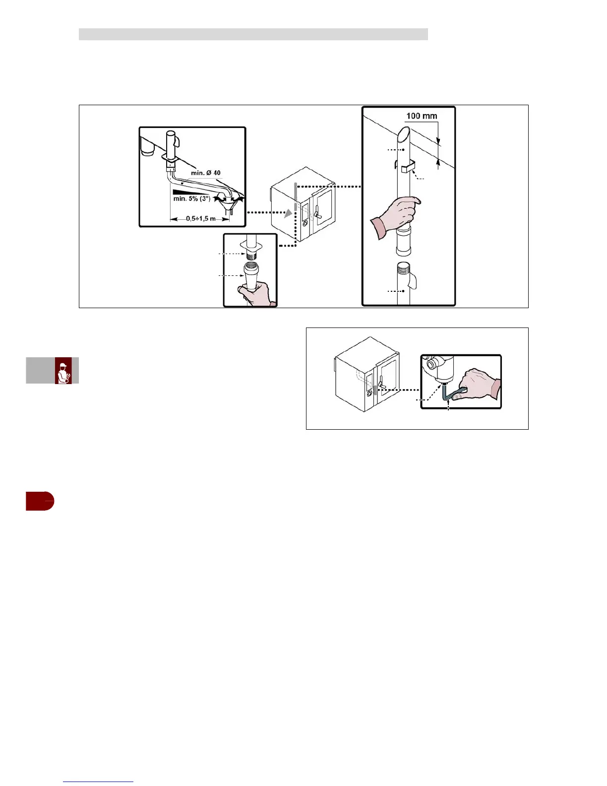 2–Connect the vent pipe (D) to the appliance connection pipe (C) and fix it to the sup-