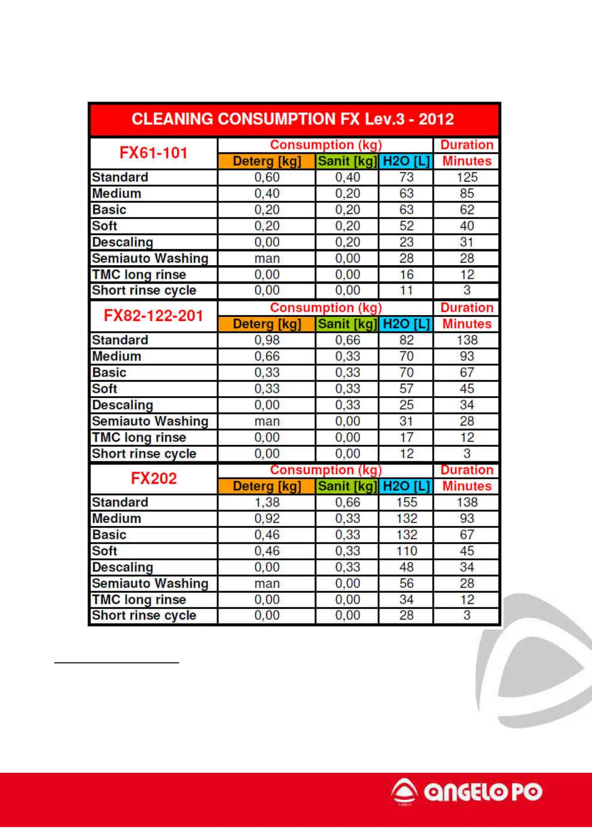 Angelo Po FX201E2 - Cleaning Consumption Table