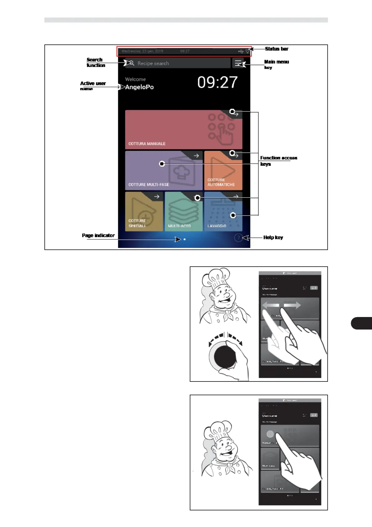 ) Select the relative function by scrolling on the screen