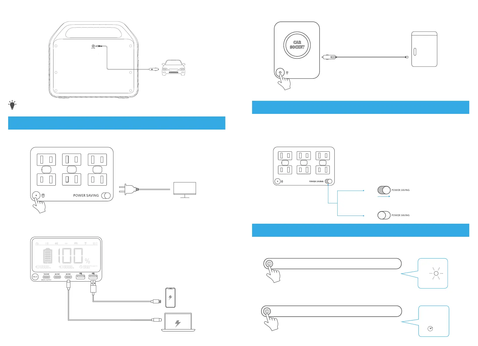 シガーソケット出力ボタンを押して、機器をシガーソケットに接続します。