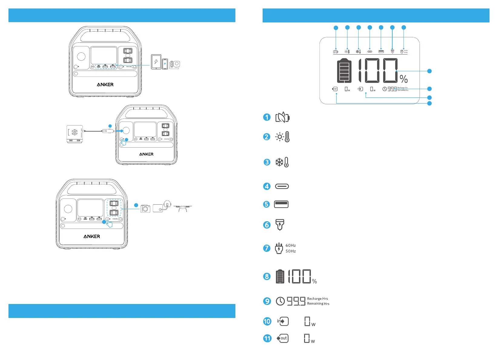 1. Les ports USB-A et USB-C permettent de brancher et de charger. Lorsque les appareils sont branchés, ils