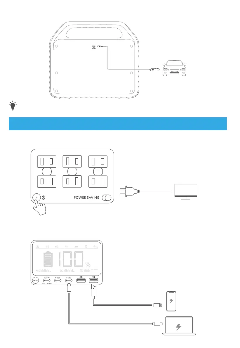 Recharge your Power Station by connecting to a car's output port with the car charging cable.