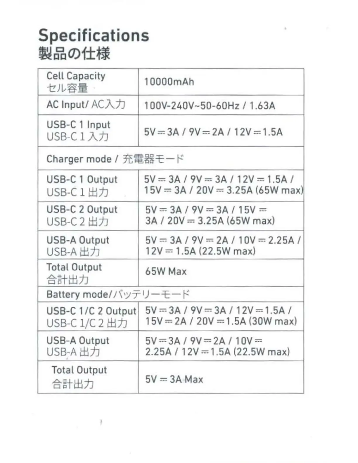 USB-C 1 Output 5V = 3A / 9V = 3A / 12V = 1.5A /