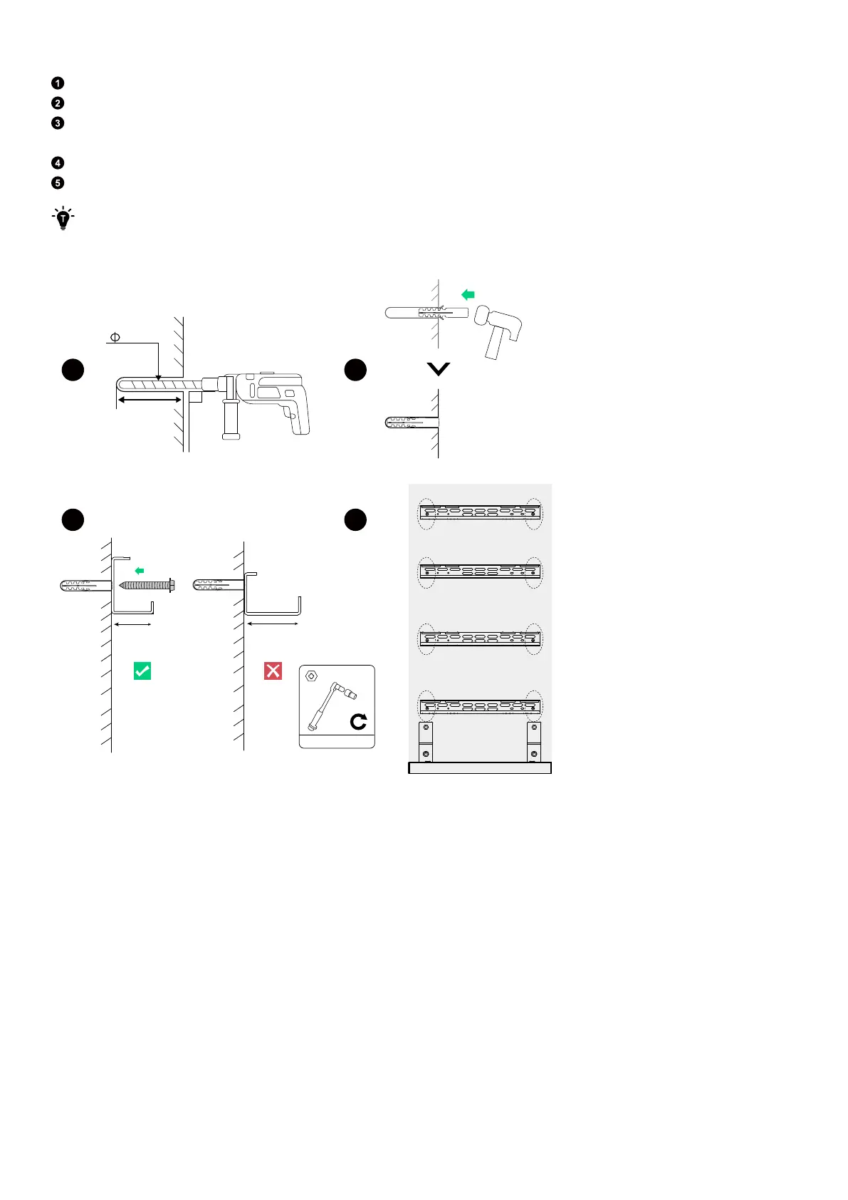 Insert the plastic anchors (M6×50 mm, included) into the pilot holes. Make sure the anchors are flush with the wall.