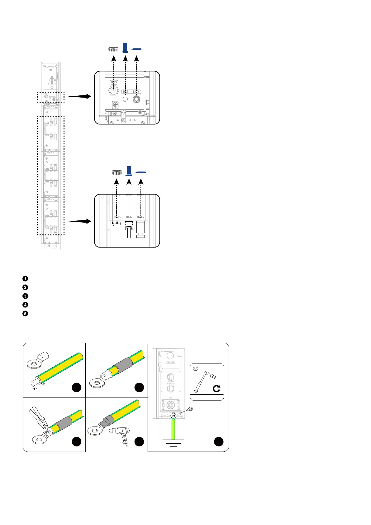 Secure the GND cables (6 mm², yellow/green, included) using the screws (M5×14 mm, included).