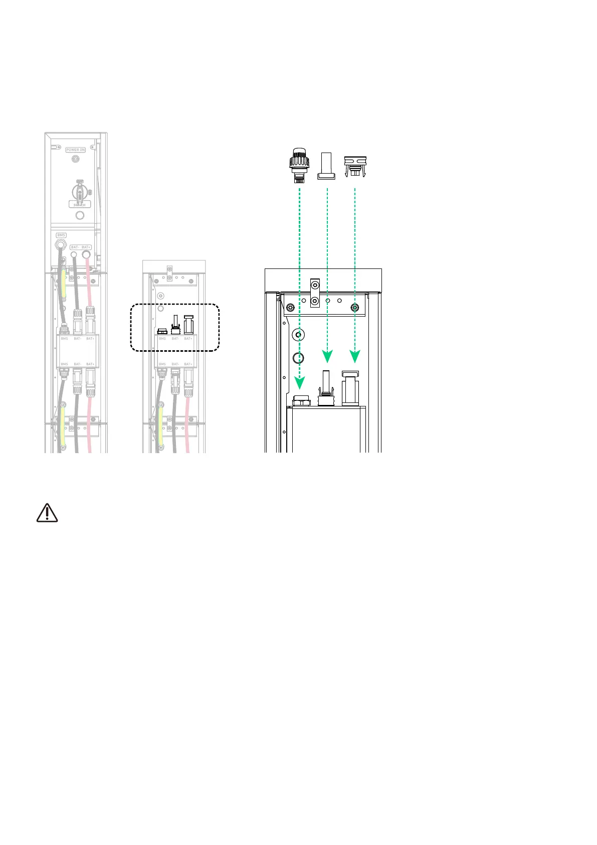 the BMS port, a female dustproof cap (included) into the negative DC power port (BAT-), and a male dustproof cap (included)