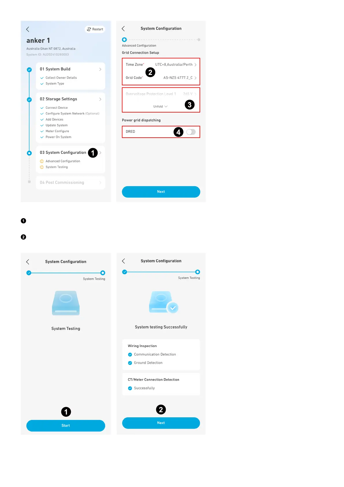Select Start to perform the system test. This involves testing the wiring, CT/meter connections, and both on-grid and o-
