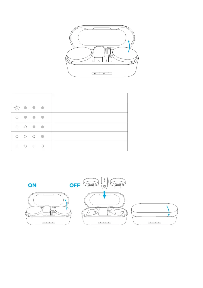 Abra o estojo carregador. Os LED indicarão o nível da bateria.