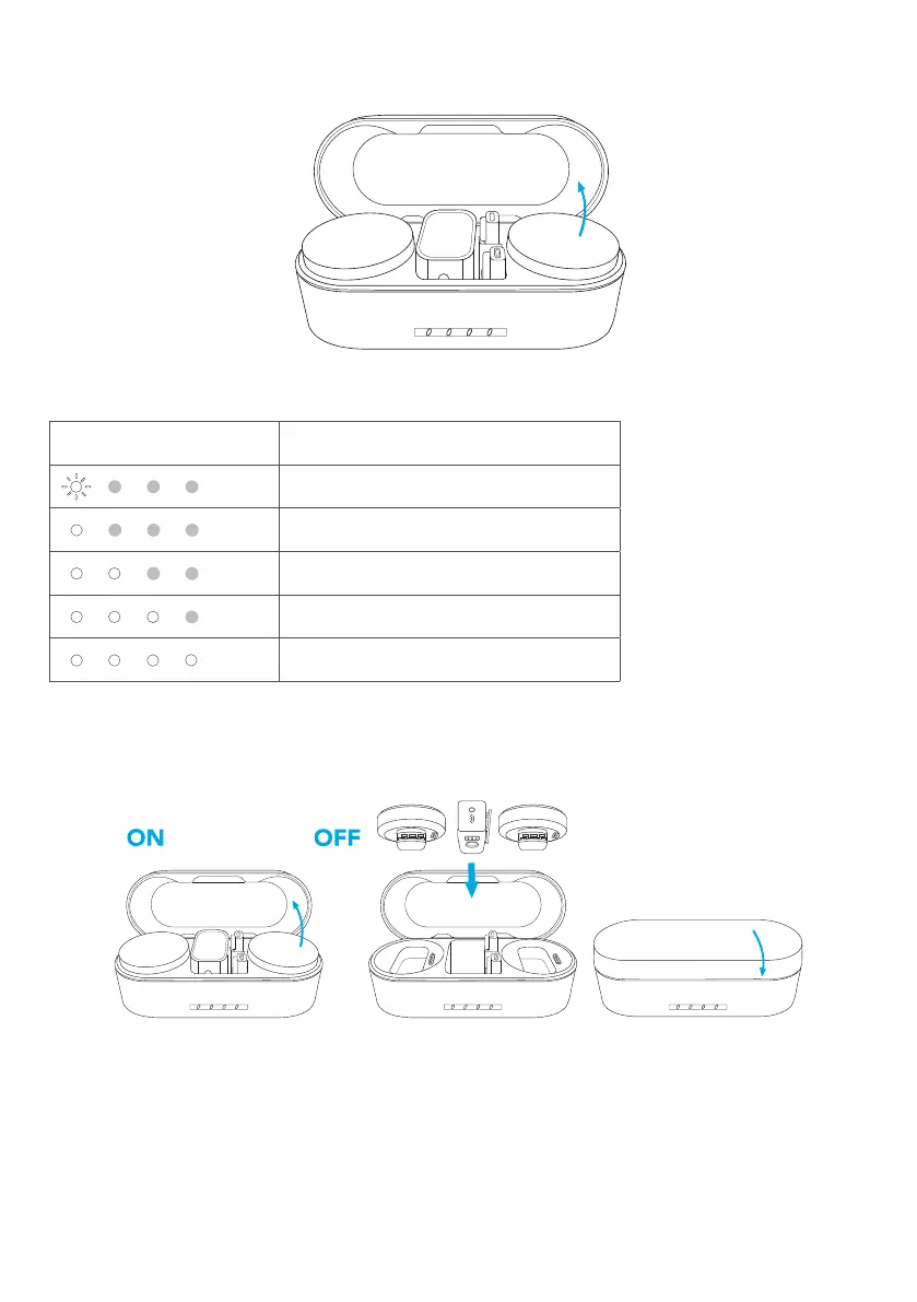 充電ケースを開くと、4 秒以内にレシーバーとトランスミッターの電源が自動的に